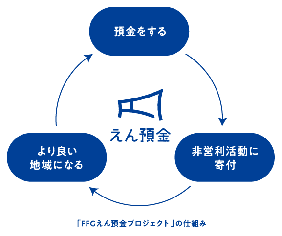 「FFGえん預金」は、「あなたの『円』が、誰かの『援』になり、地域の『縁』となる」というコンセプトのもと、利用者が「お金を預ける」という日常の行動を通じて地域の非営利活動を応援できる寄付型定期預金です。